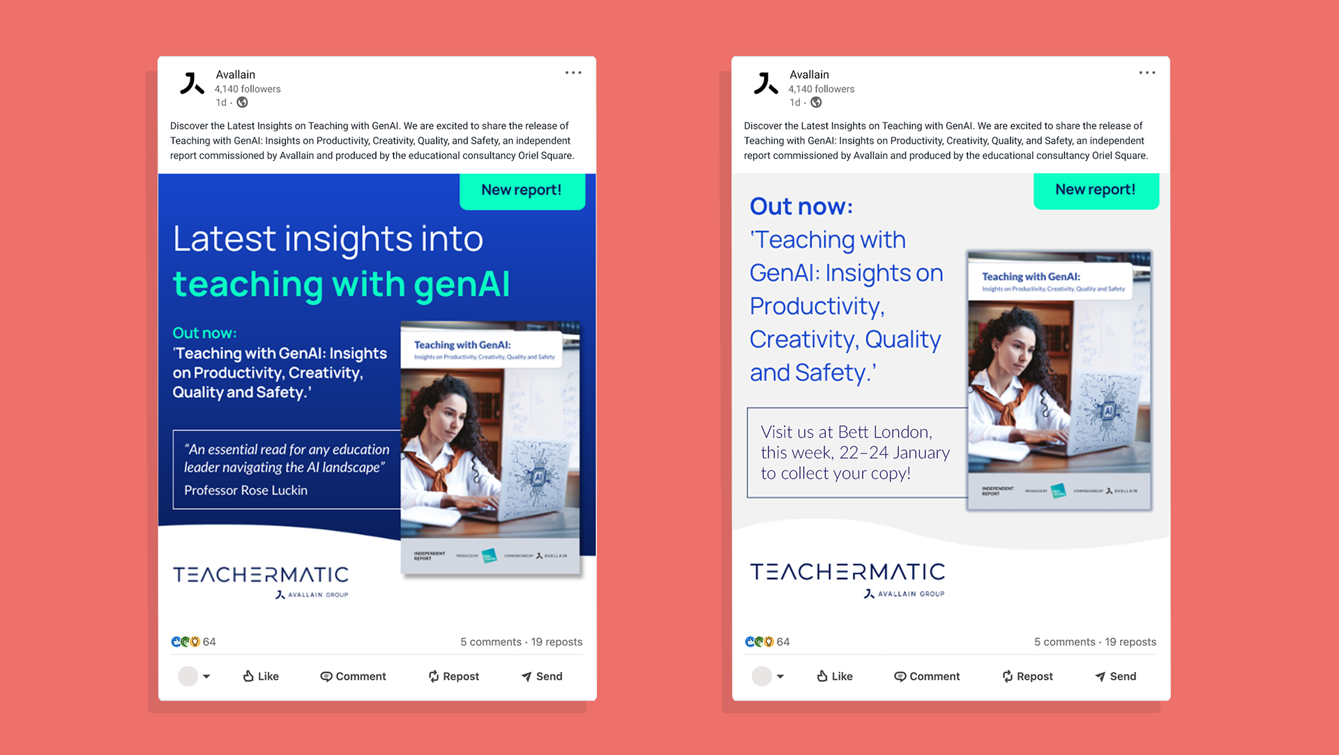 Design of cover, pages, and associated marketing materials, for a report interrogating the responsible integration of generative AI tools in the classroom, with reflections on quality, safety and best practice. The report was produced alongside social media graphics and a newsletter email, forming the project’s launch campaign. The designed assets were developed in line with the client’s existing style and branding to maintain consistency with previously published materials, while deploying a limited number of new elements to lift and segment the content.